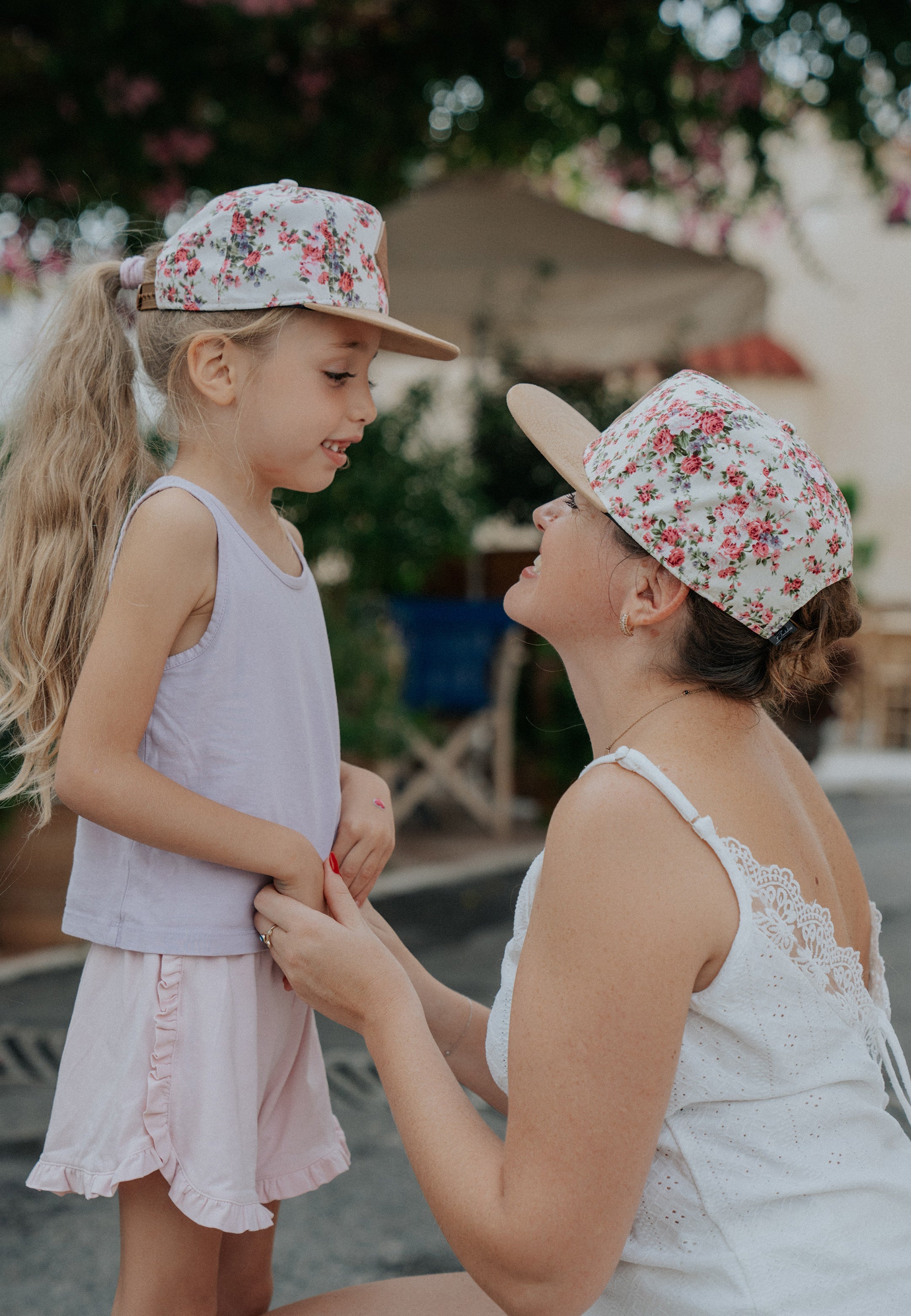 Design Coordinato per Tutte le Età: Ispirato al nostro elegante Sakura Snapback, questo set offre un fresco aspetto floreale sia per genitori che per bambini.