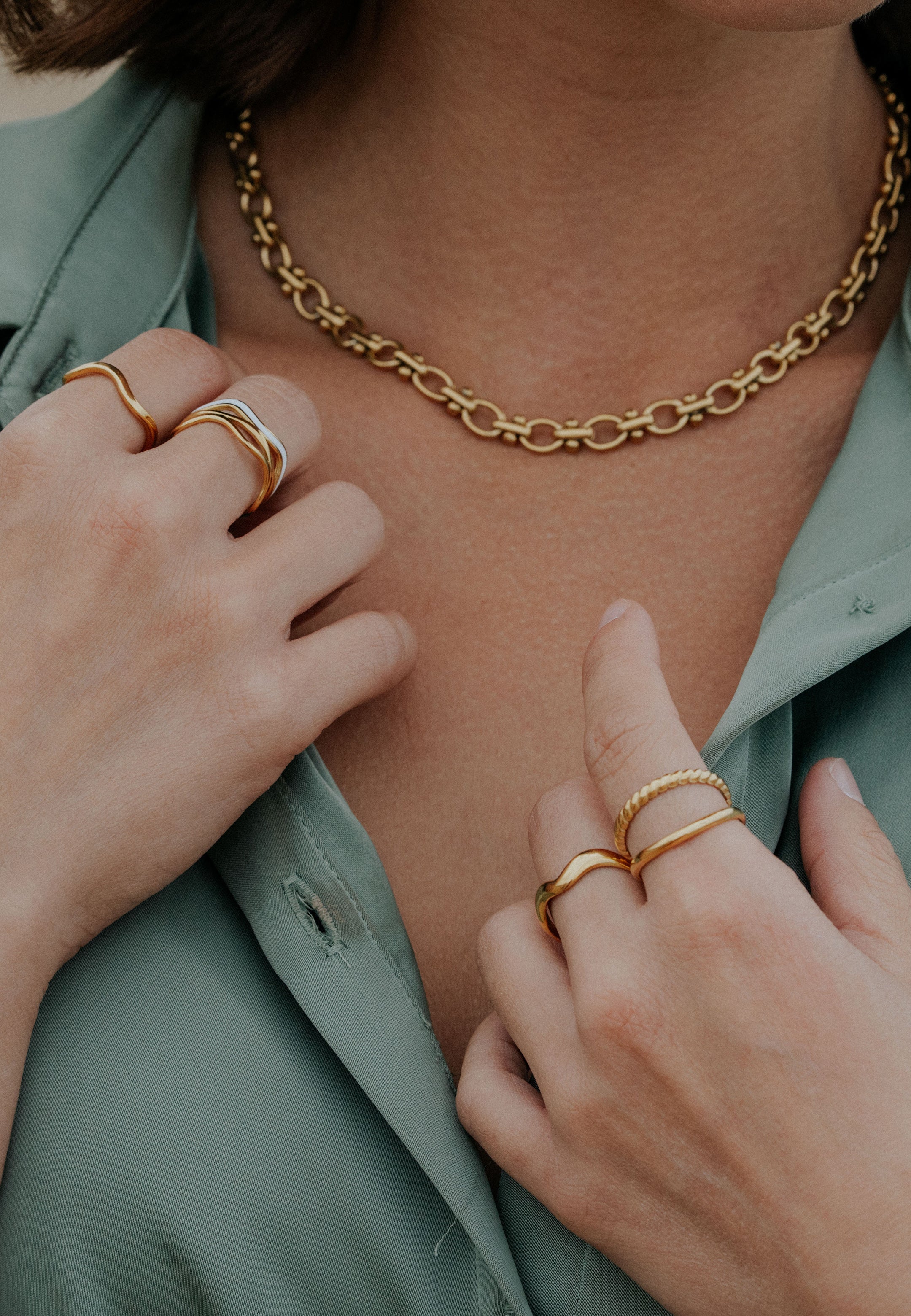 Minimalistyczny. Elegancki. Ponadczasowy. Serenity Ring ma delikatny, falisty kształt i gładkie, złociste wykończenie. Niezależnie od tego, czy nosisz go solo, czy w zestawie z innymi pierścionkami, ten model dodaje każdej stylizacji miękkości i wdzięku.