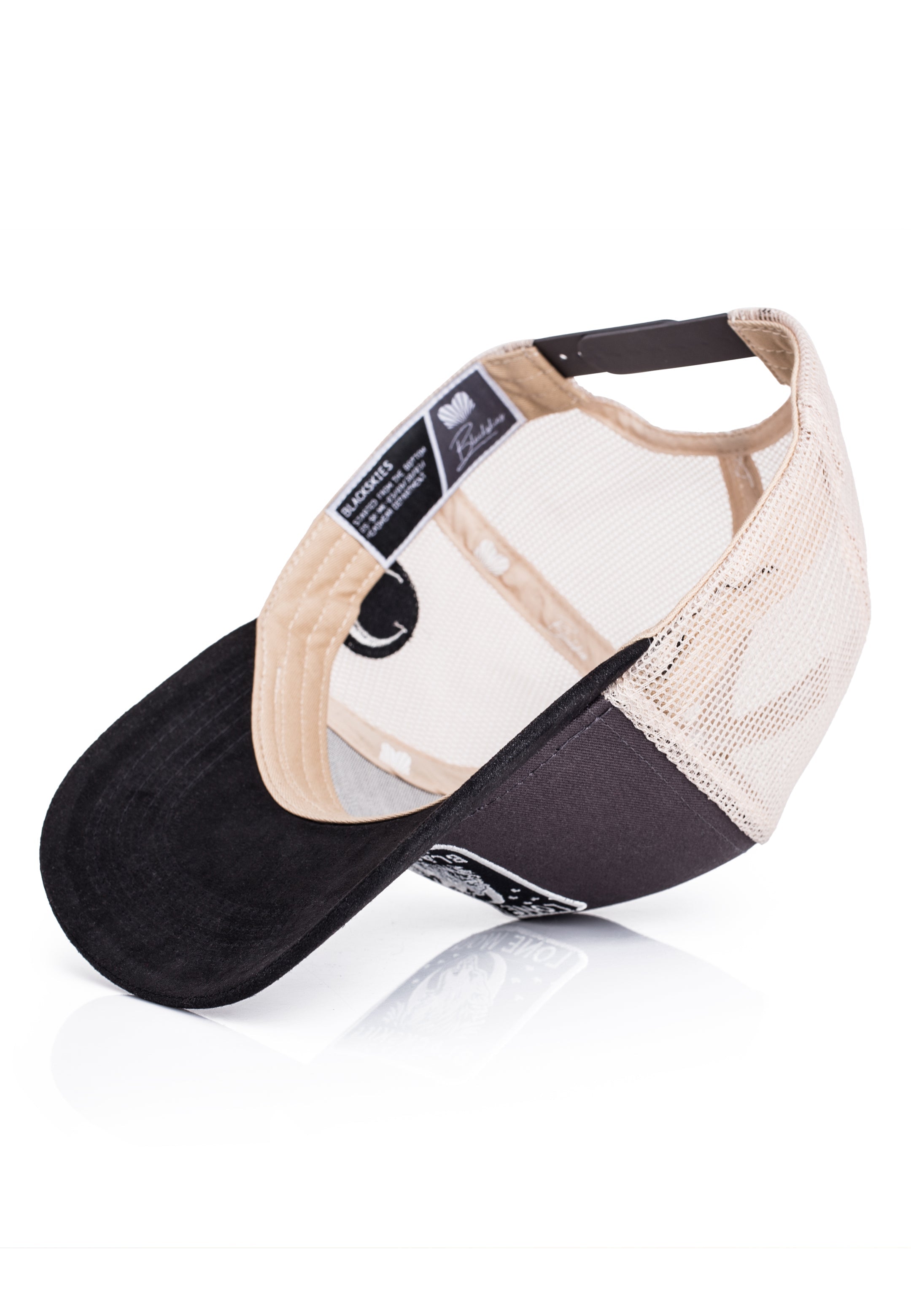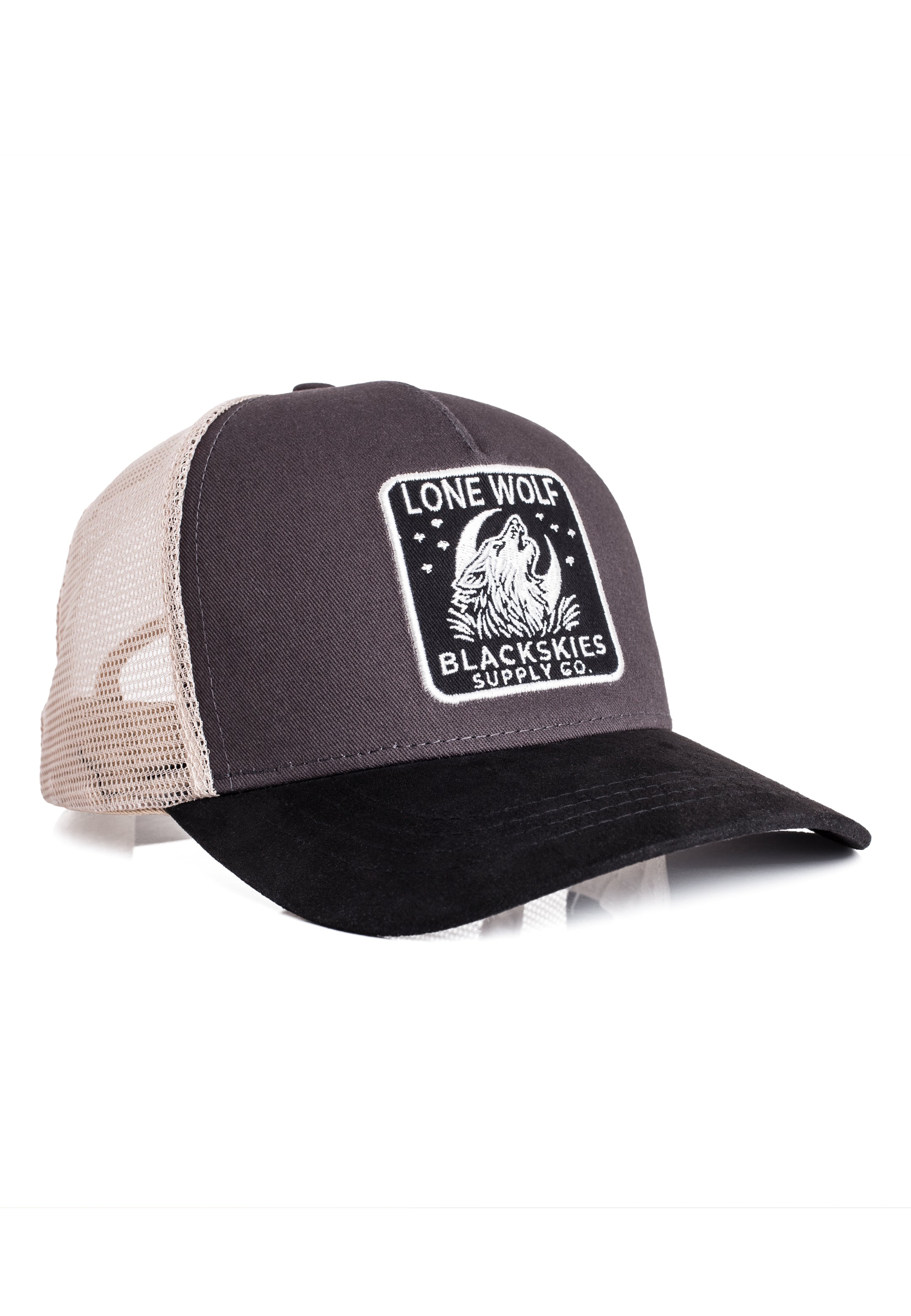 The structured front panel features a distinctive Lone Wolf – Blackskies Supply Co. embroidered patch, while the breathable mesh back ensures comfort throughout the day — whether you're on the road, outdoors, or in the city.